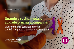 No Fevereiro Laranja e Roxo, a conscientização reforça que viver com uma condição crônica não define a pessoa. O cuidado com a saúde, inclusive bucal, deve caminhar junto com respeito, empatia e apoio.